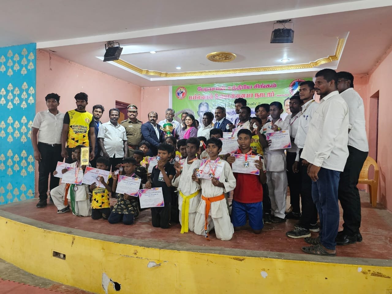 இதில் பெருங்குளம் பேரூராட்சி முன்னாள் தலைவர் சிவக்குமார் போட்டியை தொடங்கி வைத்தார். இந்த போட்டிக்கு சுமார் 300க்கும் மேற்பட்ட சிலம்பம் மற்றும் கராத்தே மாணவர்கள் பங்கேற்றனர்.