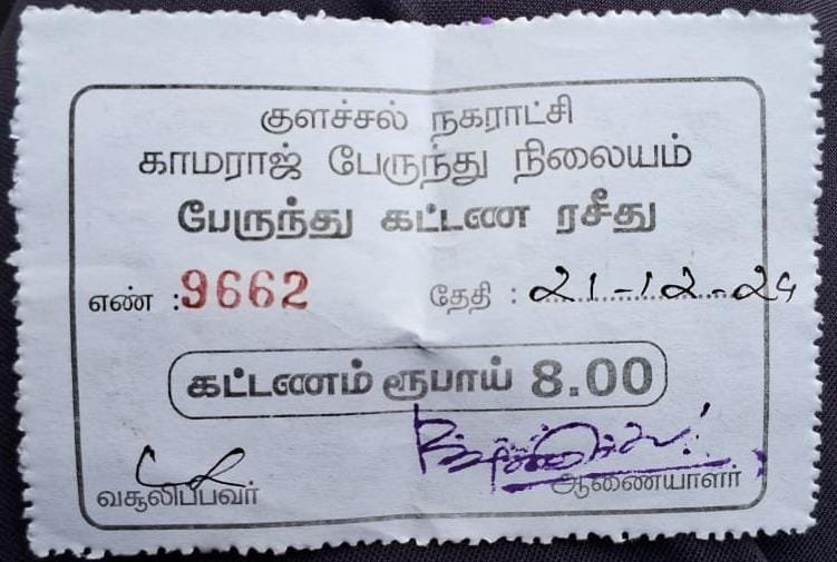 கன்னியாகுமரி மாவட்டம் குளச்சல் நகராட்சி காமராஜ் பேருந்து நிலையம் பேருந்து கட்டண ரசீது முன்னாள் ஆணையாளர் ராஜமாணிக்கம் அவர்களின் பெயரில் சீல் வைத்த ரசீது புக் பயன்படுத்தி வருகிறார்கள்