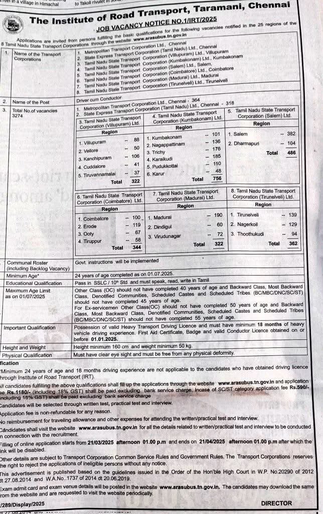 தமிழகத்தில் உள்ள 8 போக்குவரத்து மண்டலங்களில் காலியாக உள்ள 3274 ஓட்டுநர், நடத்துனர் பணியிடங்களுக்கான அறிவிப்பு வெளியிடப்பட்டுள்ளதுநாளை +21.03.2025) தொடங்கி ஏப்ரல் 21 ஆம் தேதி வரை விண்ணப்பிக்கலாம் என்றும் அறிவிக்கப்பட்டுள்ளது Post navigation கண்ணி வெடிகளை, முன்கூட்டியே கண்டறிந்து எச்சரிக்கை செய்யும் உபகரணத்தை கண்டுபிடித்த நெல்லை மாணவருக்கு நெல்லை சரக காவல்துறை டிஐஜி பாராட்டு நாசரேத்தில் பள்ளி ஆசிரியையிடம் செயின் பறிக்க முயன்ற வாலிபர் கைது – பைக் பறிமுதல்