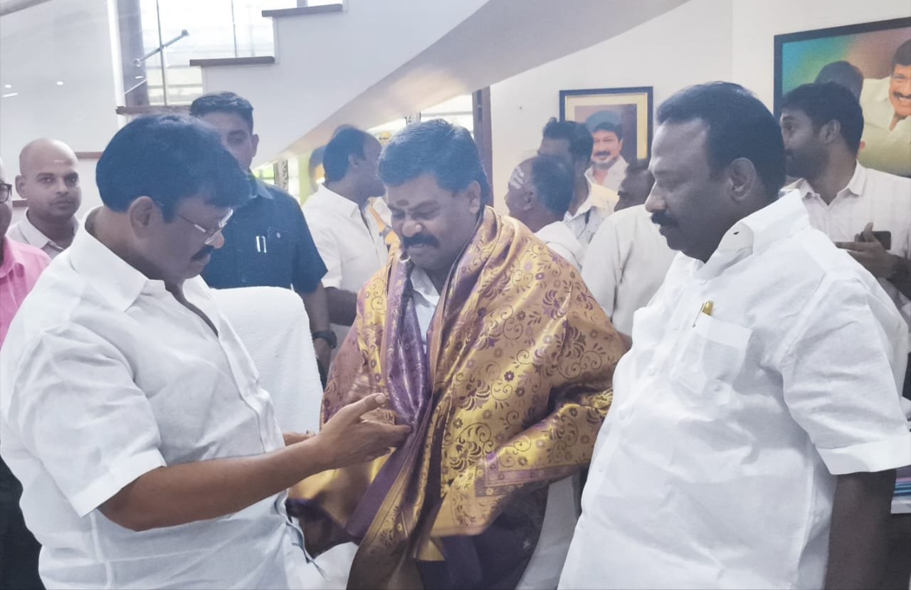 திருவள்ளூர் கிழக்கு மாவட்ட திமுக மீஞ்சூர் மேற்கு ஒன்றிய பொறுப்பாளர் ஆ. ராஜா நியமிக்கப்பட்டதை முன்னிட்டு சிறுபான்மையினர் மற்றும் வெளிநாடு வாழ் தமிழர் நலத்துறை அமைச்சர் ஆவடி சாமு நாசர், திருவள்ளூர் கிழக்கு மாவட்ட பொறுப்பாளர் எம் எஸ் கே ரமேஷ் ராஜ் ஆகியோரை சந்தித்து சால்வை அணிவித்து வாழ்த்து பெற்றார்