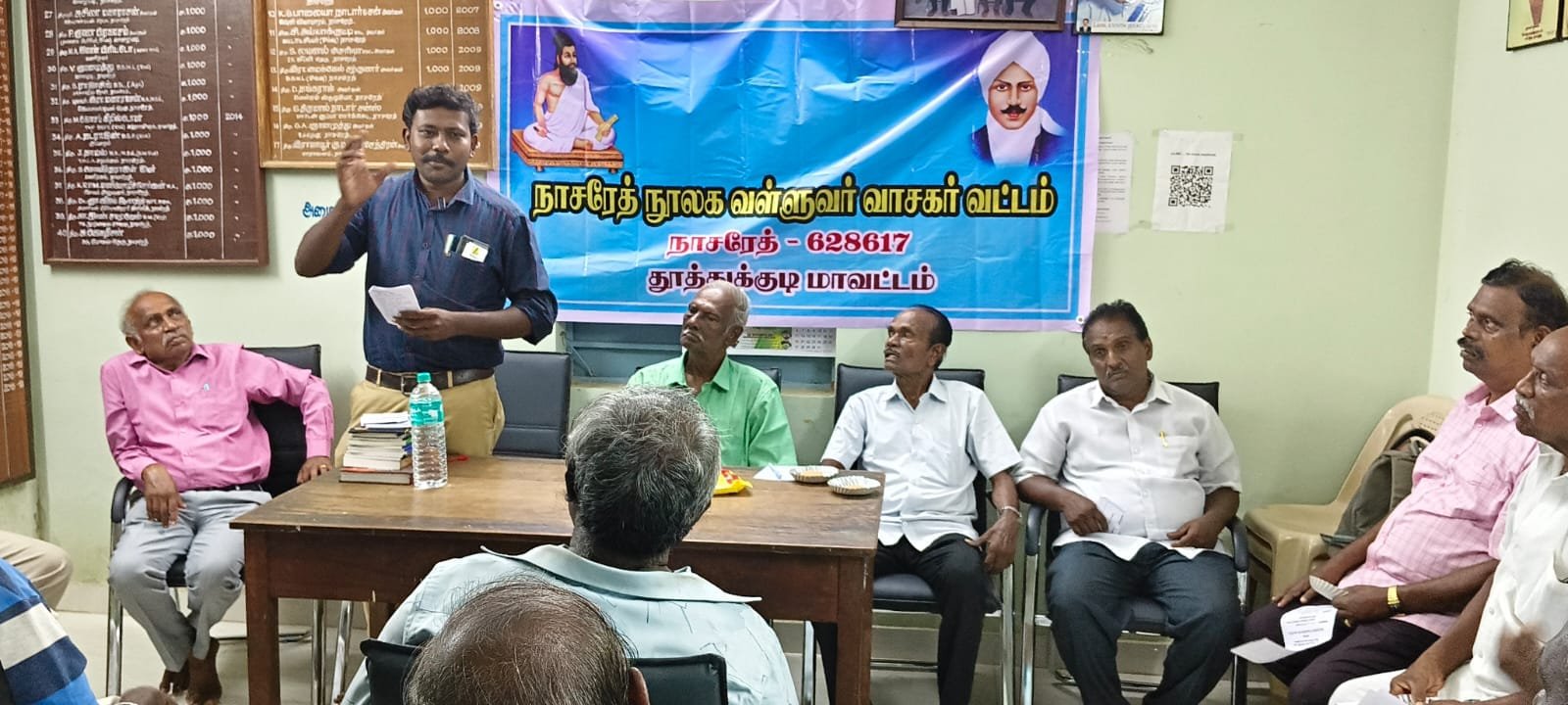 நாசரேத் நூலக வள்ளுவர் வாசகர் வட்டத்தின் மாதாந்திர இலக்கியக் கூட்டம் நாசரேத் நூலக அரங்கத்தில் வைத்து நடைபெற்றது.வாசகர் வட்டத்தின் தலைவரும் ஓய்வு பெற்ற வட்டாட்சியருமான அய்யாக்குட்டி தலைமை வகித்தார்.நாசரேத் கிளை நூலகர் பொன் ராதா முன்னிலை வகித்தார்.வாசகர் வட்டத்தின் துணைத்தலைவர் கொம்பையா வரவேற்றுப் பேசினார்.