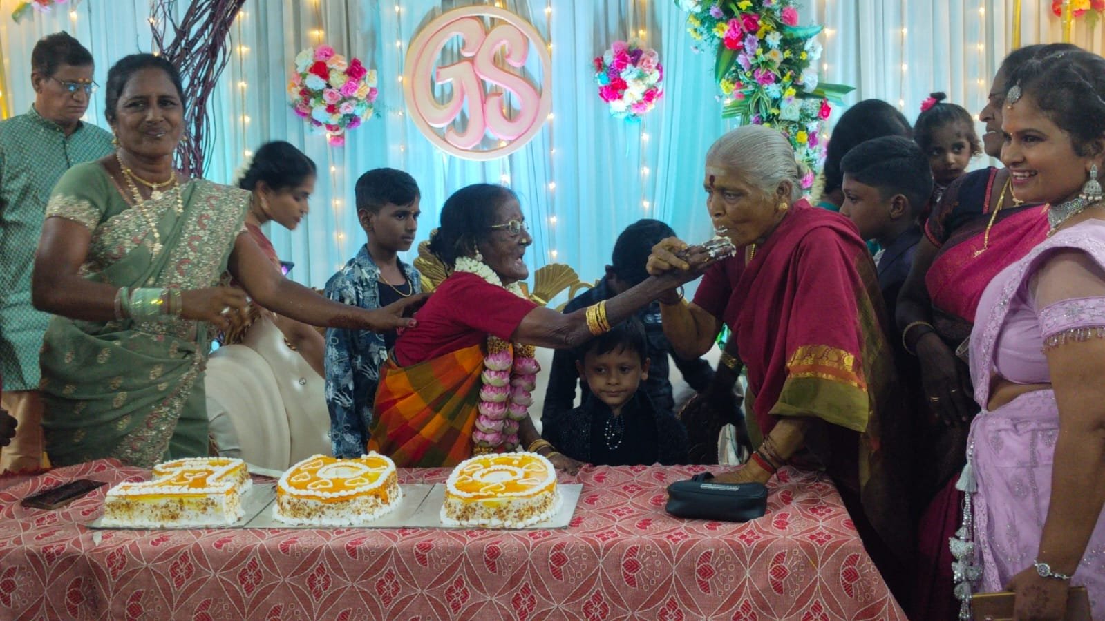 இந்நிலையில் மூதாட்டி சாந்தி இவரது நூறாவது பிறந்தநாள் விழாவை தனது பேரன் திருமண விழாவில் வைத்து தனது மகள் மற்றும் பேரன் கொள்ளு பேரன் கொள்ளு பேரனின் குழந்தைகளுடன் தனியார் திருமண மண்டபத்தில் கேக் வெட்டி பட்டாசு வெடித்து மற்றும் உறவினருடன் கொண்டாடினார்