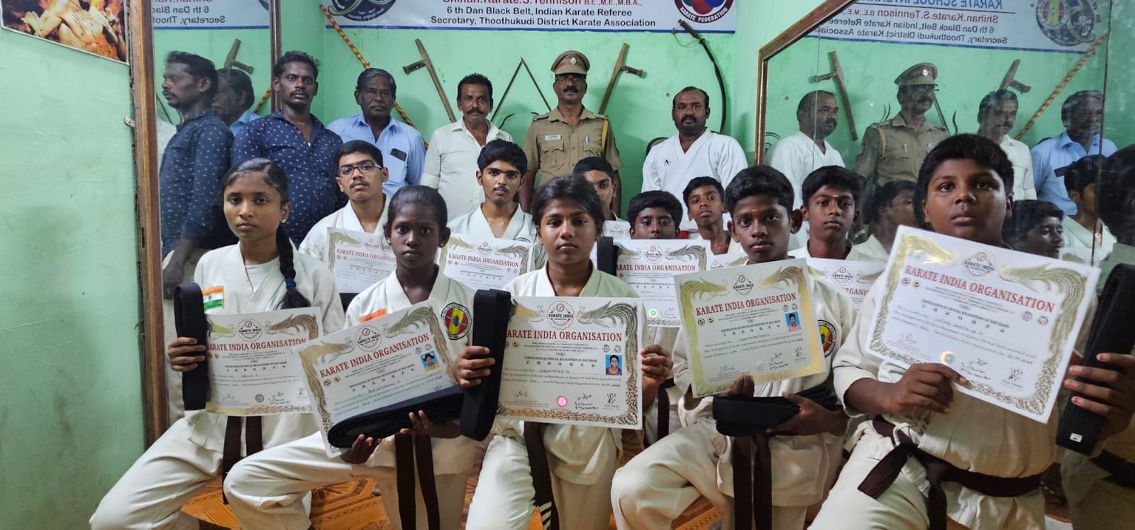 சிறப்பு விருந்தினராக நாசரேத் காவல் நிலைய உதவி ஆய்வாளர் சத்தியமூர்த்தி அவர்கள் கலந்து கொண்டு மாணவர்களுக்கு அறிவுரை கூறிய கராத்தே கருப்பு பட்டயமும் சான்றிதழும் வழங்கினார்.
