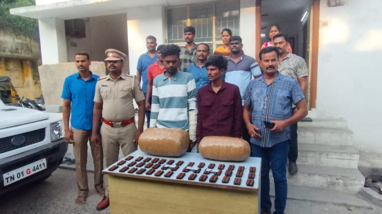 சென்னை செங்குன்றம் பேருந்து நிலையத்தில் சந்தேகத்திற்கு இடமான வகையில் கையில் பையுடன் சுற்றி திரிந்து கொண்டிருந்த இளைஞர்கள் இருவரை செங்குன்றம் சாரகத்திற்கு உட்பட்ட மீஞ்சூர் மதுவிலக்கு அமலாக்க பிரிவு காவல் துறையினர் பிடித்து விசாரித்த போது இருவரும் உனக்குப் பின் முரணான தகவல்களை தெரிவித்ததால் அவர்கள் வைத்திருந்த கைப்பையை சோதனையிட்ட போது அதில் 15 கிலோ கஞ்சா பொட்டலம், 1300 கோதை மாத்திரைகள் அடங்கிய ஆட்டைகள் இருப்பது தெரியவந்தது.