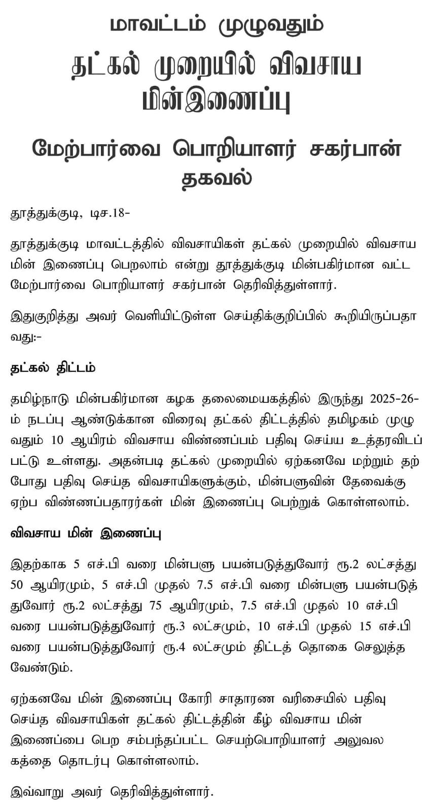 அதன்படி விவசாயிகள் மின்வாரிய செயற்பொறியாளர் அலுவலகத்தை இன்று (18.12.2025) தொடர்பு கொண்டபோது தமிழ்நாடு முழுவதும் இருந்து பத்தாயிரம் விண்ணப்பங்கள் பூர்த்தி செய்யப்பட்டு விட்டதால், இனி வருபவர்களுக்கு தட்கல் முறையில் மின் இணைப்பு வழங்க முடியாது என்றும், அரசு மீண்டும் தட்கல் முறையில் விவசாய மின் இணைப்பு வழங்கப்படும் என்று அறிவித்தால் விண்ணப்பித்து மின் இணைப்பு பெற்றுக் கொள்ளலாம் என்று தெரிவிக்கின்றனர்