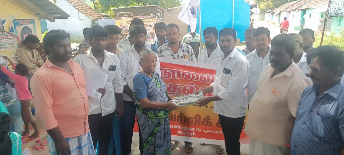 நடிகர் விஜய் தமிழக வெற்றிக் கழகம் என கட்சி தொடங்கியதை வரவேற்று நிர்வாகிகள் சாத்தான்குளத்தில் சேலை மற்றும் இனிப்பு வழங்கி கொண்டாடினர்.